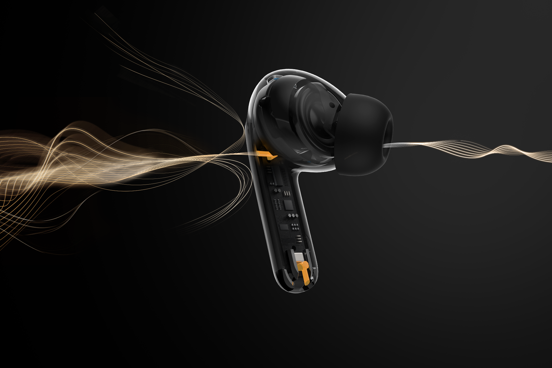 Located near the speaker inslde the earbud, thesemics work wlth a feedback control system to cancelout any remaining noise in your ear canal. This smartdesign reduces the need for a tlght seal, so there's noneed to force-flt your earbuds-just wear them comfortably and enjoy conslstent noise cancellation inany setting.